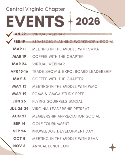 The purpose of the Central Virginia Chapter is to provide education, networking, resources and advocacy for community associations and the professionals and volunteers who serve them.